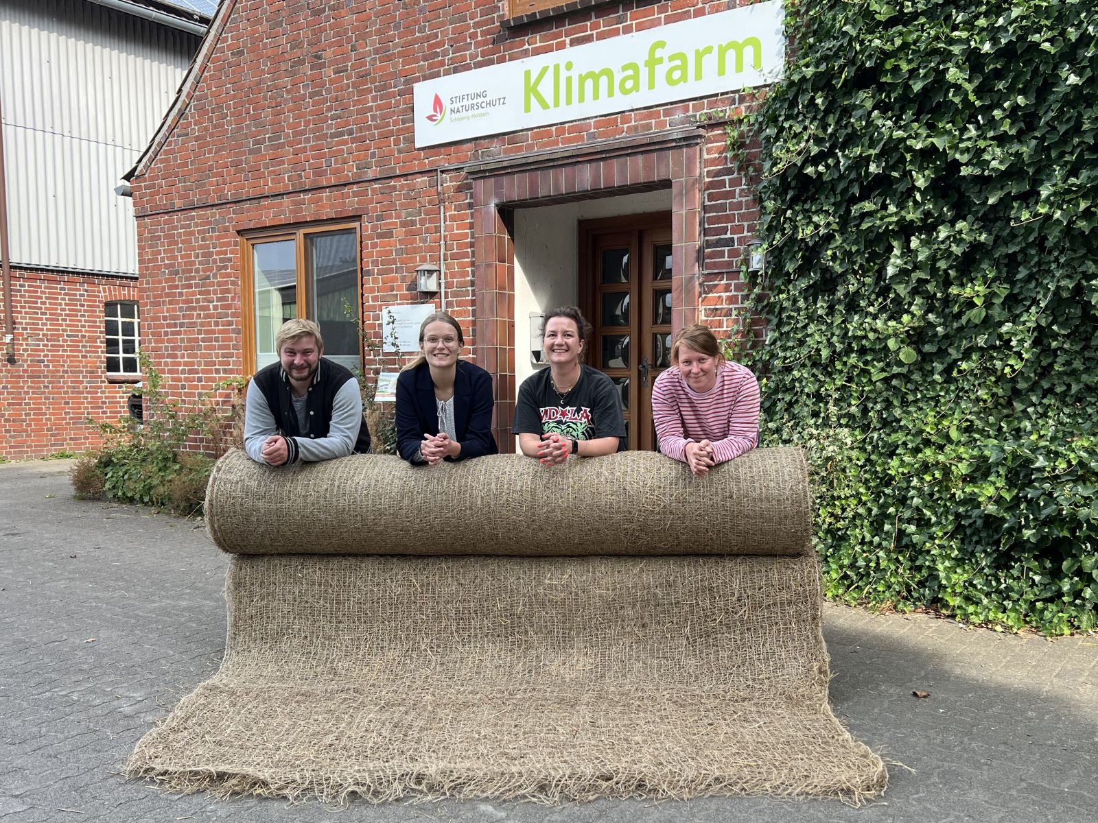 Picture: Christopher Kleinert (Wacken Open Air), Insa Trede (Wacken Open Air), Marie Bajohr (Climate Farm Project), Elena Zydek (Climate Farm Project) with a soil protection mats made from paludiculture biomass of the Climate Farm project (Foto: Stiftung Naturschutz Schleswig-Holstein)